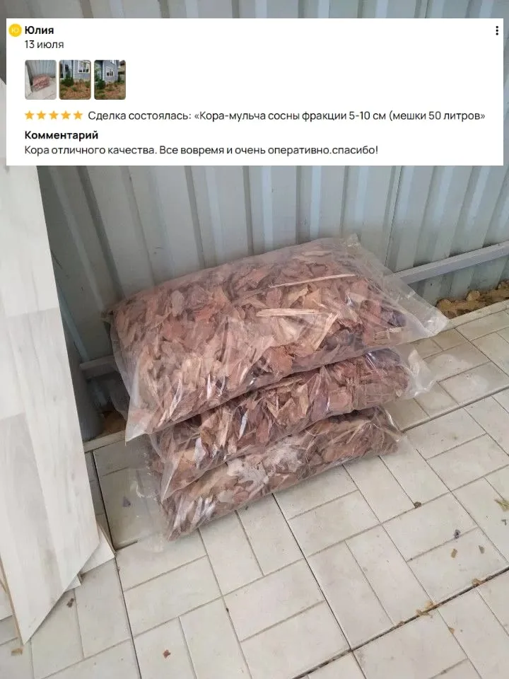 Кора сосны в мешках объемом 50 литров и фракции 0–1, 1–3, 2–5, 5–10, 10–20 см, премиум-класса, без мусора и искусственных добавок. Мульча из коры сосны отлично подходит для всех видов растений, она не только улучшает качество почвы, но и обеспечивает дополнительную защиту корневой системе растений от перегрева, пересыхания и замерзания. Кора-мульча сосны также имеет низкий уровень кислотности, что делает ее идеальной для применения на различных участках.