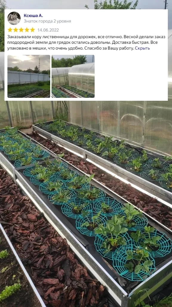 Применение: Подходит для мульчирования клумб, газонов, плодовых и декоративных деревьев. Также применяется для поддержания влажности и температуры почвы, предотвращая рост сорняков.
